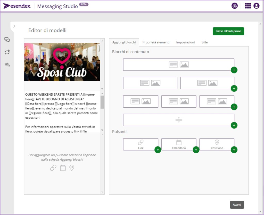 La piattaforma Studio di Esendex viene utilizzata per la creazione di modelli di messaggio (per conversazioni marketing e utilità iniziate da SposiClub) e la gestione delle conversazioni WhatsApp (iniziate dagli utenti o da SposiClub) per comunicare con:
